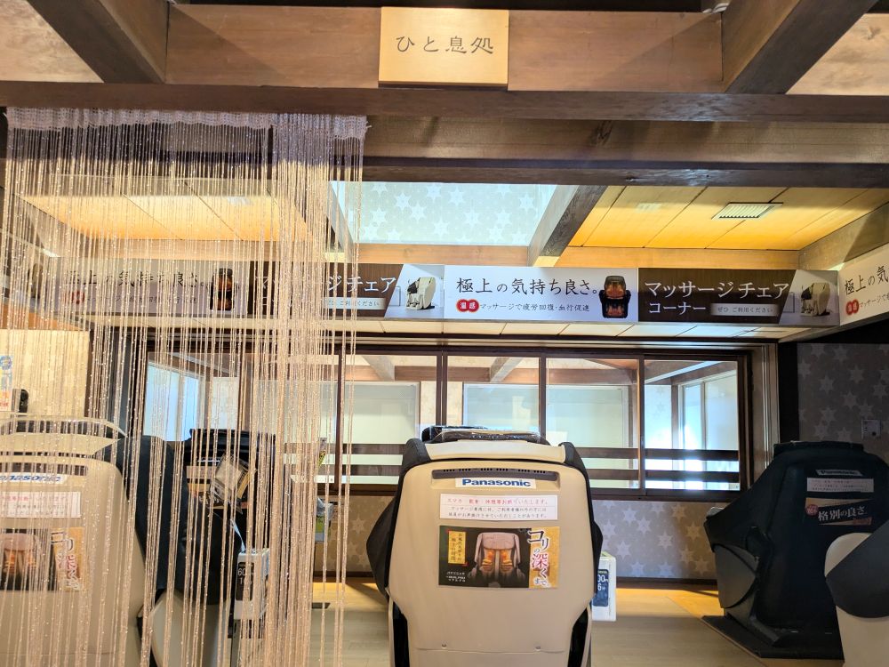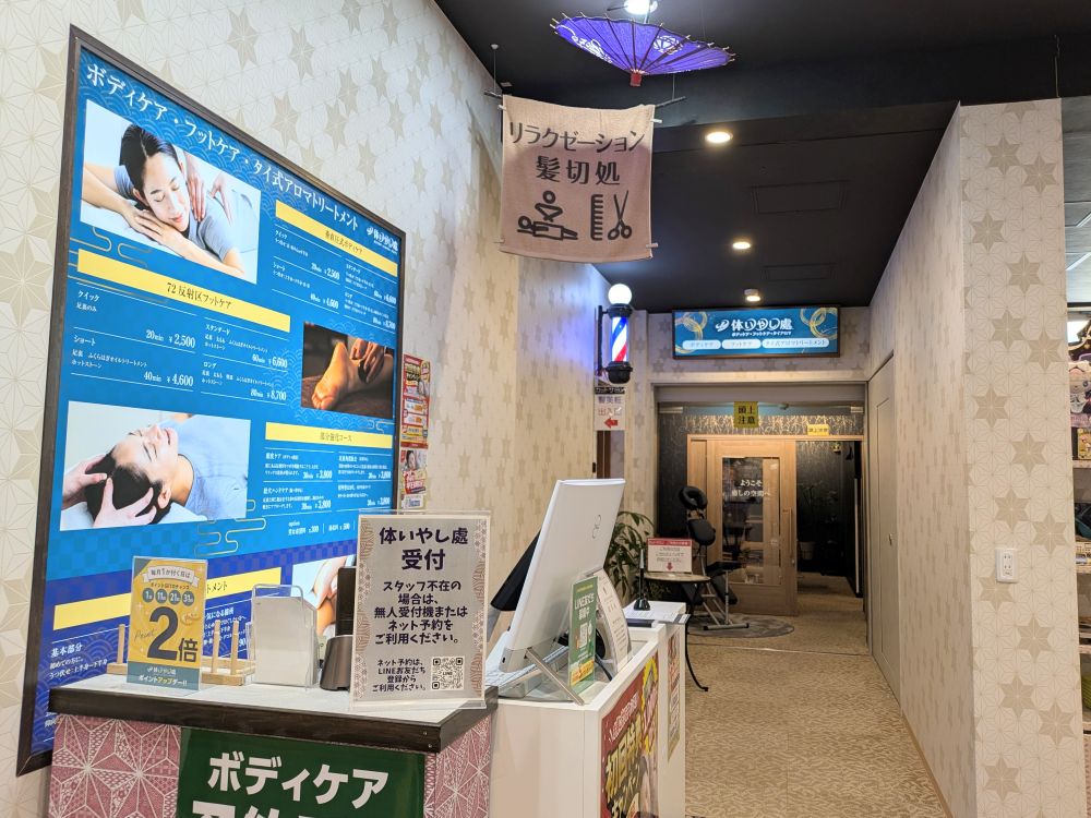 物販コーナーの近くには、リラクゼーション・髪切処が奥まで続いています。