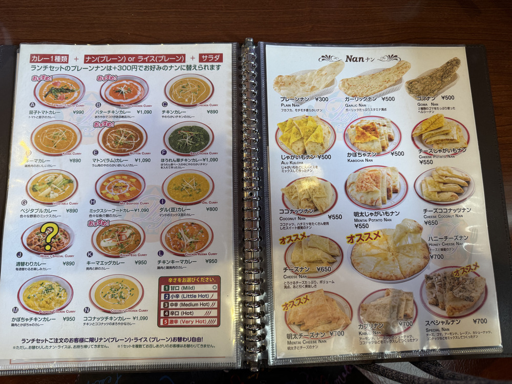 メニューを開くと、ずらりと並ぶカレーの種類の多さに目を奪われます。