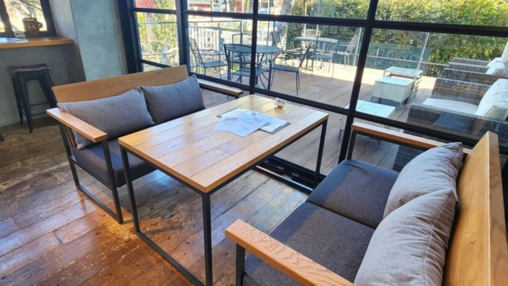 広々としたスペースにテーブルやソファ席が配置されており、天気の良い日は外の空気を感じながら、ゆったりとしたカフェ時間を楽しめます。
