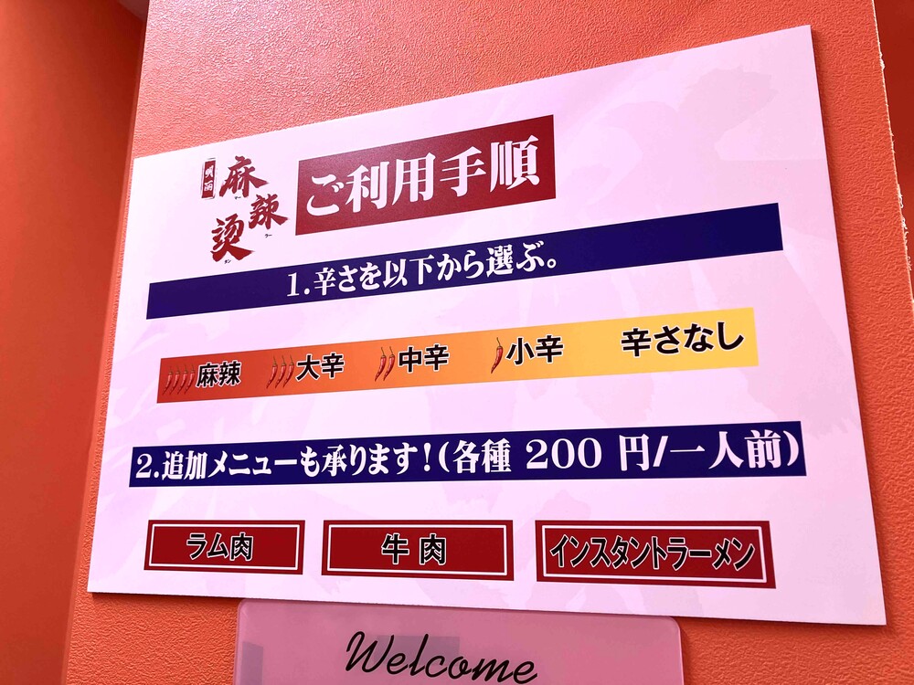 辛さは、辛さなし~麻辣までの5段階。麻辣は麻辣湯の特徴でもあるしびれる辛さだそうです。