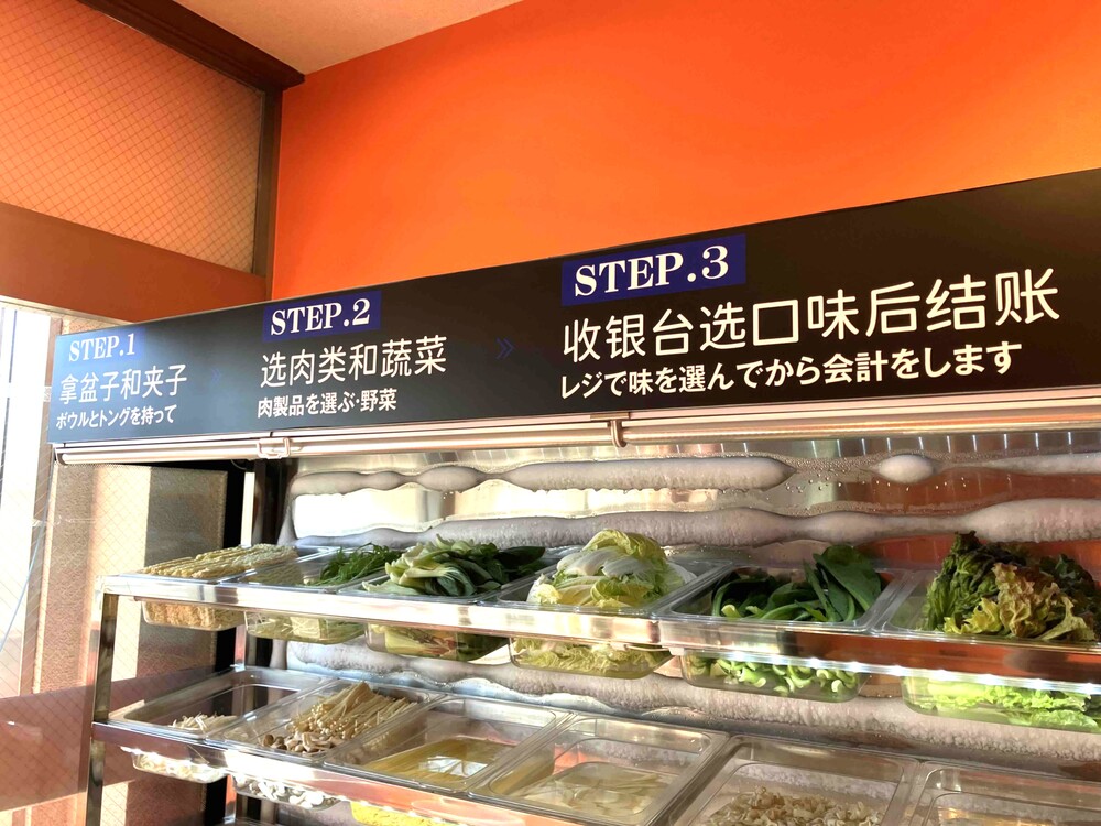 注文方法は入って左側にある具材棚の上部に中国語と日本語で書かれていました。本場中国の方も来店されるということがうかがえますね。