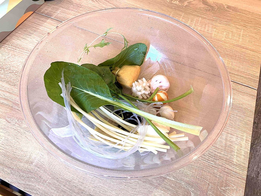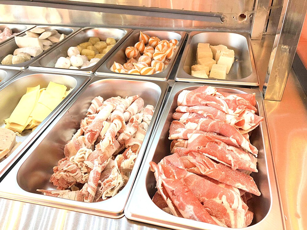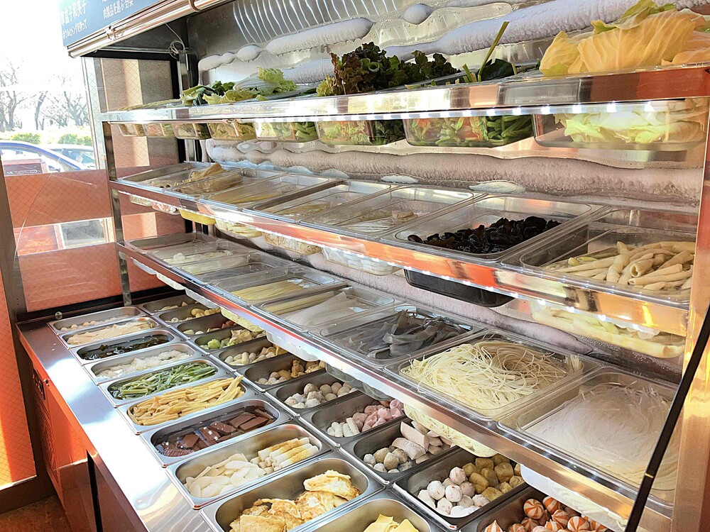 下段には練り物や油揚げの巾着、ラム肉、餃子、たまご焼き、チーズなどがありました。