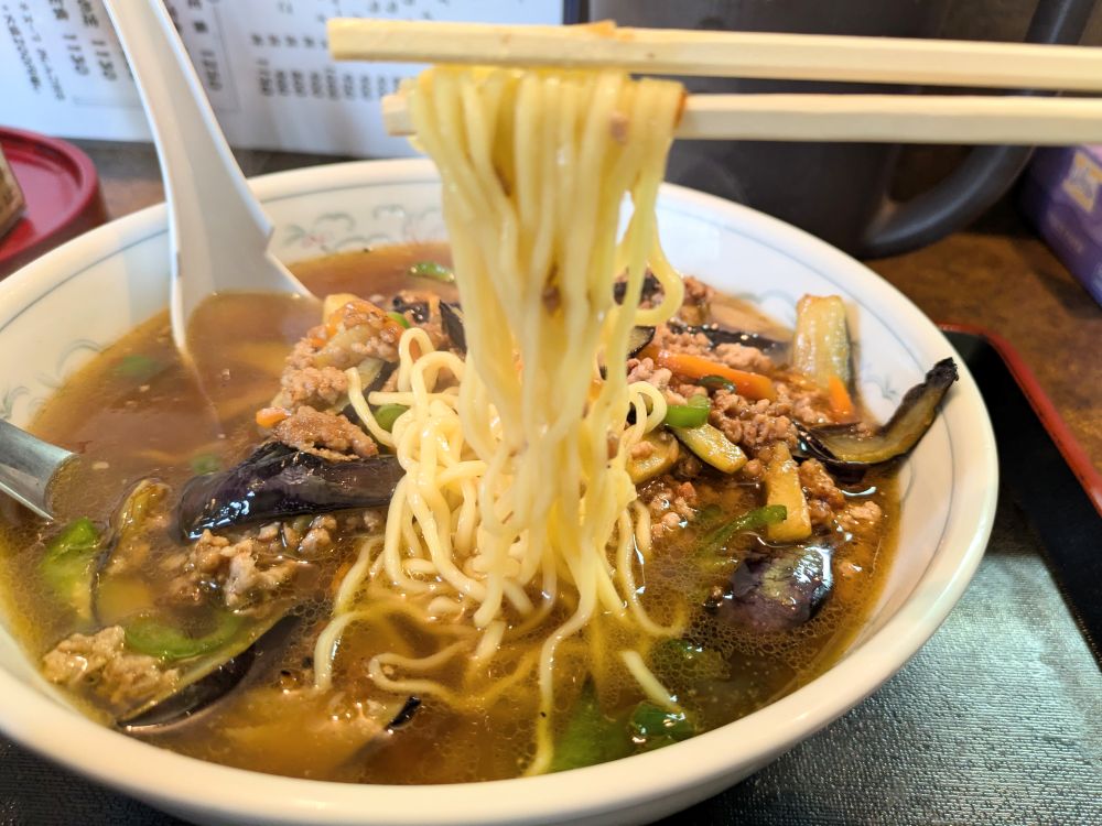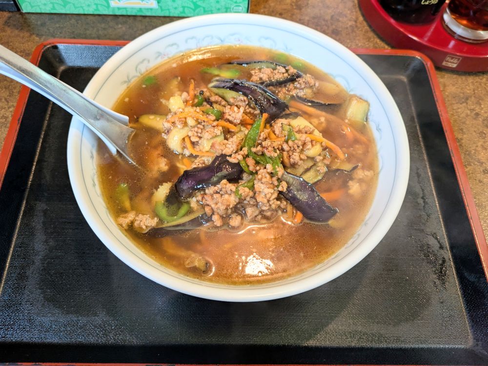 聞いたところ、ひき肉と茄子などの野菜を炒めたものがラーメンにのっているそうです。