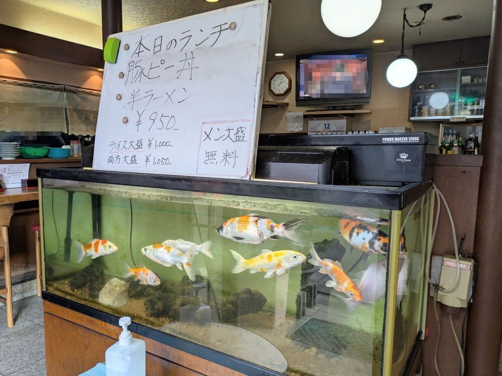 店に入るとすぐ目の前に水槽が!鯉でしょうか。悠々と泳いでいます。