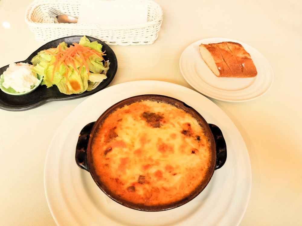 こちらは私が注文した「なすとお肉のトマトチーズグラタン」にサラダ・バケット・ドリンクがついたセットです。