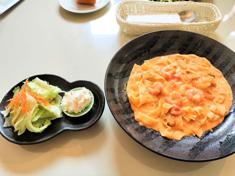 夫は冬季のおすすめ「小海老のトマトクリームソースフェットチーネ」とサラダセットを注文しました。