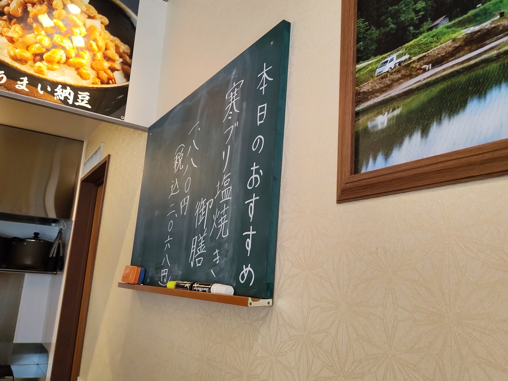 この日のおすすめは「寒ブリの塩焼き御膳」。脂のりのよい季節の味です。旬の魚を取り入れる姿勢からも、焼き魚に力を入れていることが伝わります。