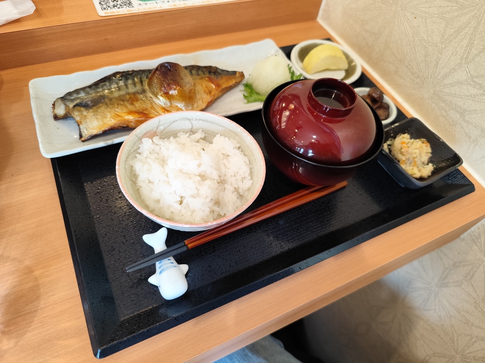 焼きたてのとろさばを中心に、ごはん、味噌汁、小鉢が並ぶ王道の定食スタイルです。余計な装飾はなく、整った印象です。
