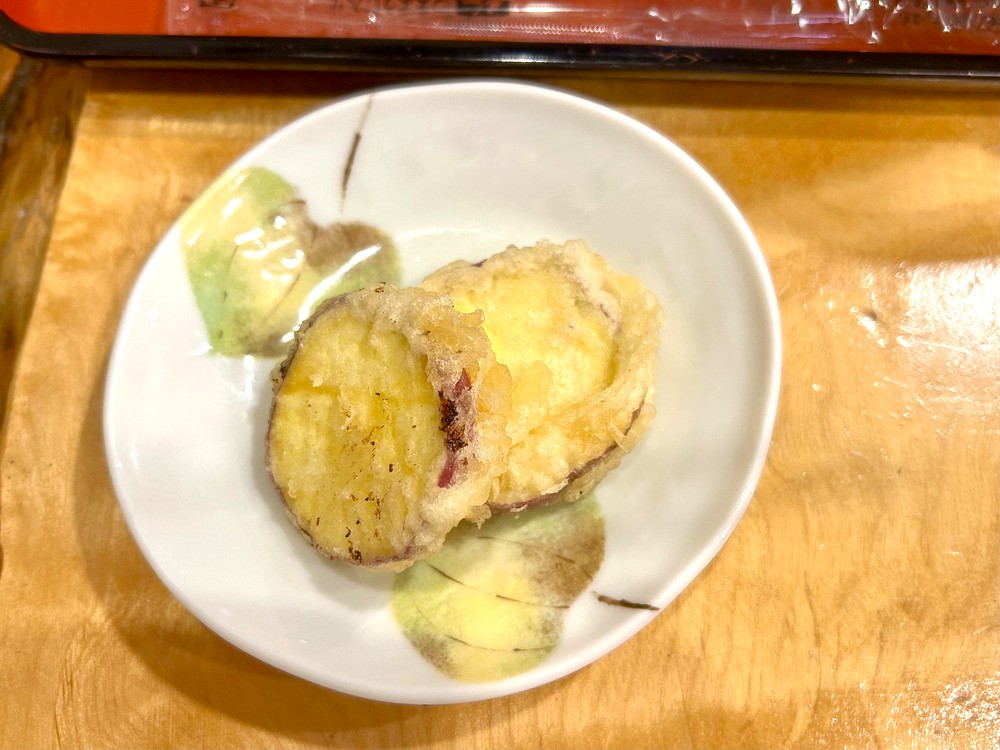 途中で、セルフサービスコーナーにあるさつまいもの天ぷらもいただくことに。日替わりでこうした天ぷらなどが、サービスで置いてあるようです。