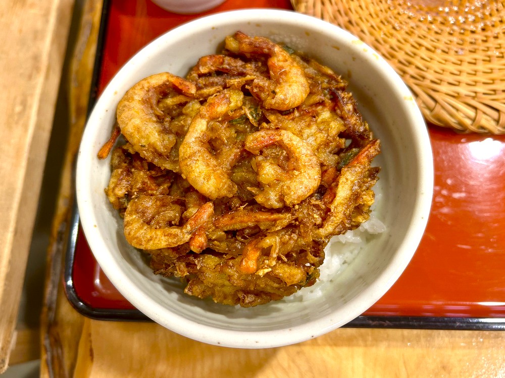 続いてこちらのかきあげ丼。濃いめの黒っぽいタレが、かきあげ全体によく染みています。甘辛くしっとりとしたかきあげと、炊き立てツヤツヤのご飯。この2つの相性が抜群!海老やにんじんなどの具材が詰まったかきあげは、小ぶりながらしっかりボリュームがあります。