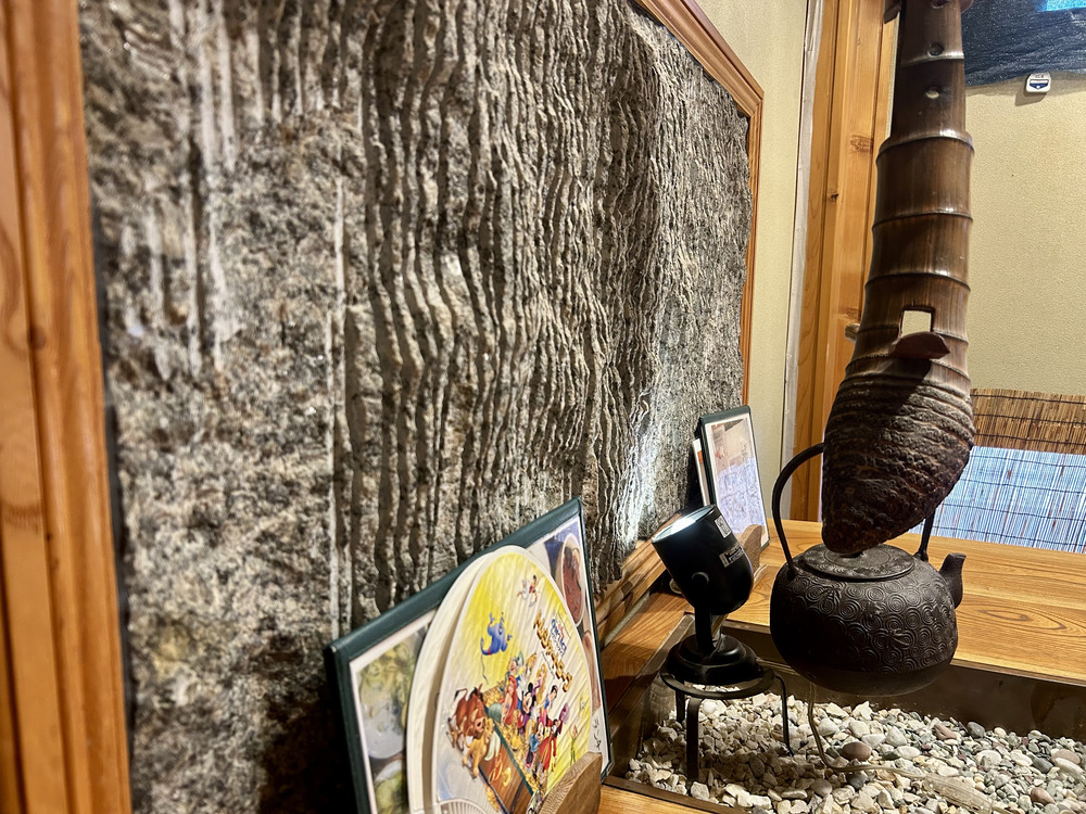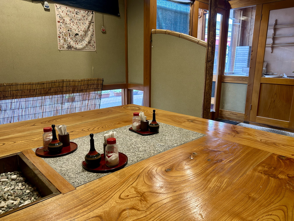 今回座った大きなテーブルには、小さな囲炉裏がありました。ライトに照らされた石の壁は、夜にグッと趣が増しそう。メニューと一緒に、うちわもしっかり完備されています。