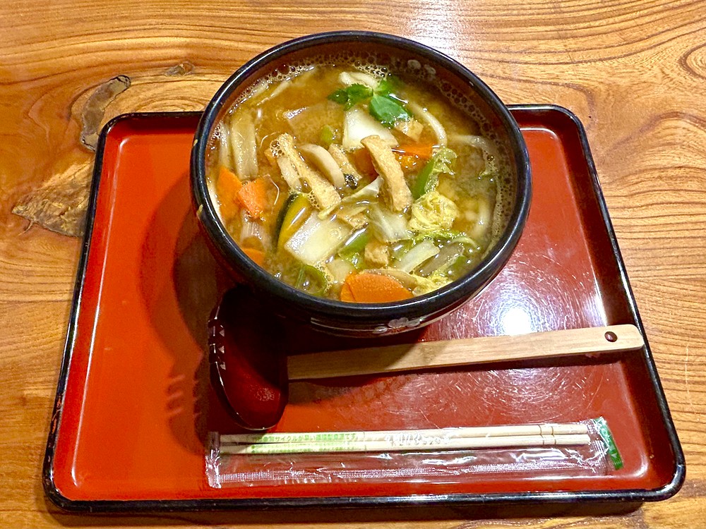 味噌野菜うどんが到着。オーナーさんがテーブルに近づいた瞬間、まだ数10cm離れているにもかかわらず、濃い鰹出汁の香りが、フワッと漂ってきました!