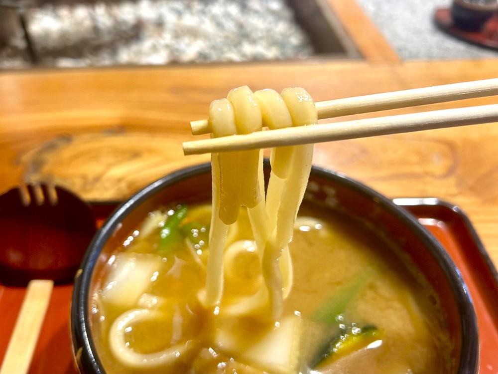 次は主役のうどん。麺の表面がツルツルで、照明の光を反射するほど。みっちりと小麦粉が詰まったような、モチモチのうどんは、喉越しもとてもツルツル!スルスルとお腹に収まっていきます。特別麺の量が多いわけではありませんが、これはしっかり満腹になりそう。しかも腹持ちも良さそうです。