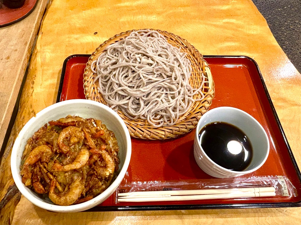 ざるにたっぷりのお蕎麦と、小ぶりなかき揚げ丼のセット。この量で1000円はお手頃。