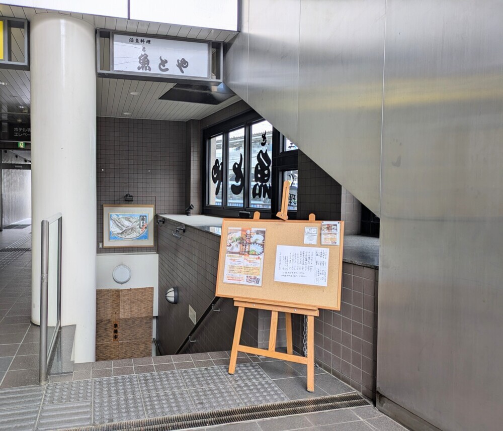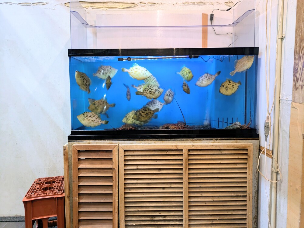 降りていくと地下1階にお店があり、入り口でお魚が泳ぐ水槽がお出迎えしてくれますよ。