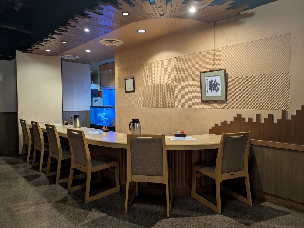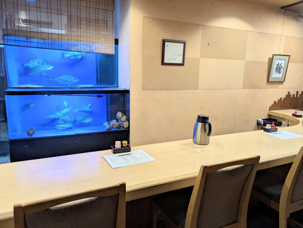 店内に入ると、生け簀のある落ち着いた雰囲気のカウンター席があります。