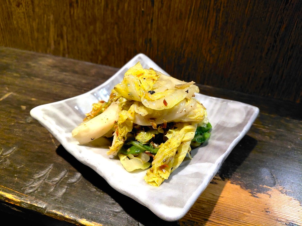 最初にきたのは「春キャベツとしらすのオイル漬け」。食感がシャキシャキとしていて、しらすの香りがとても香ばしかったです。