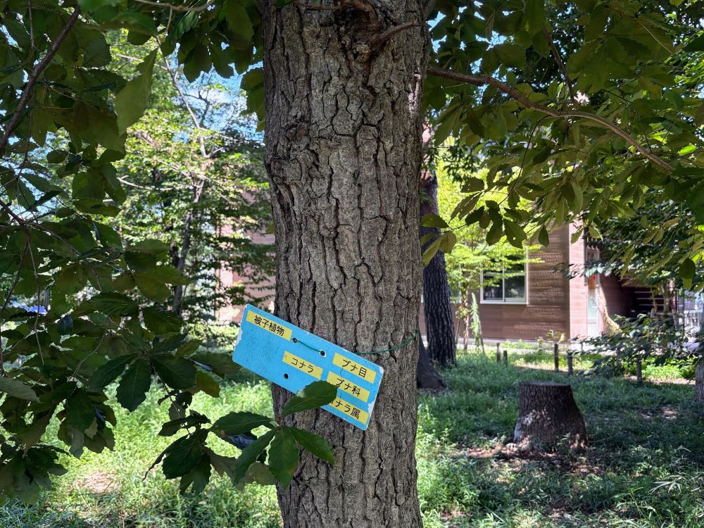 樹木には小学校の授業でつけたと思われる、植物の名前が書かれた看板も設置されていて、散歩しながら植物の勉強ができます。