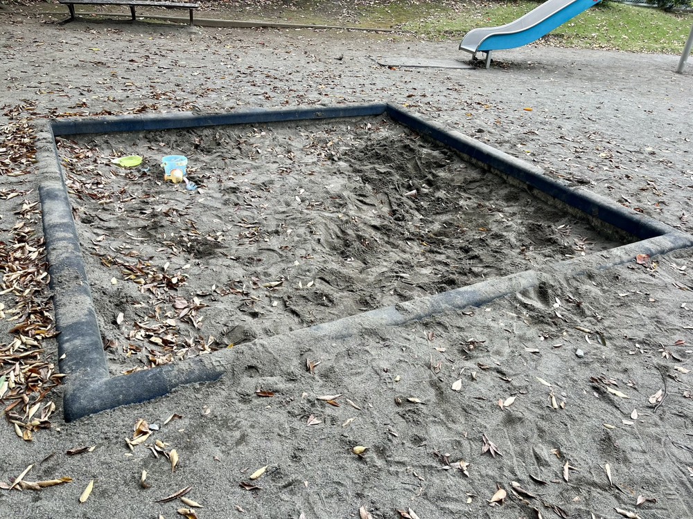 砂場の淵の部分から、少し下がったところに砂が入っているので、淵の部分に座ることができます。