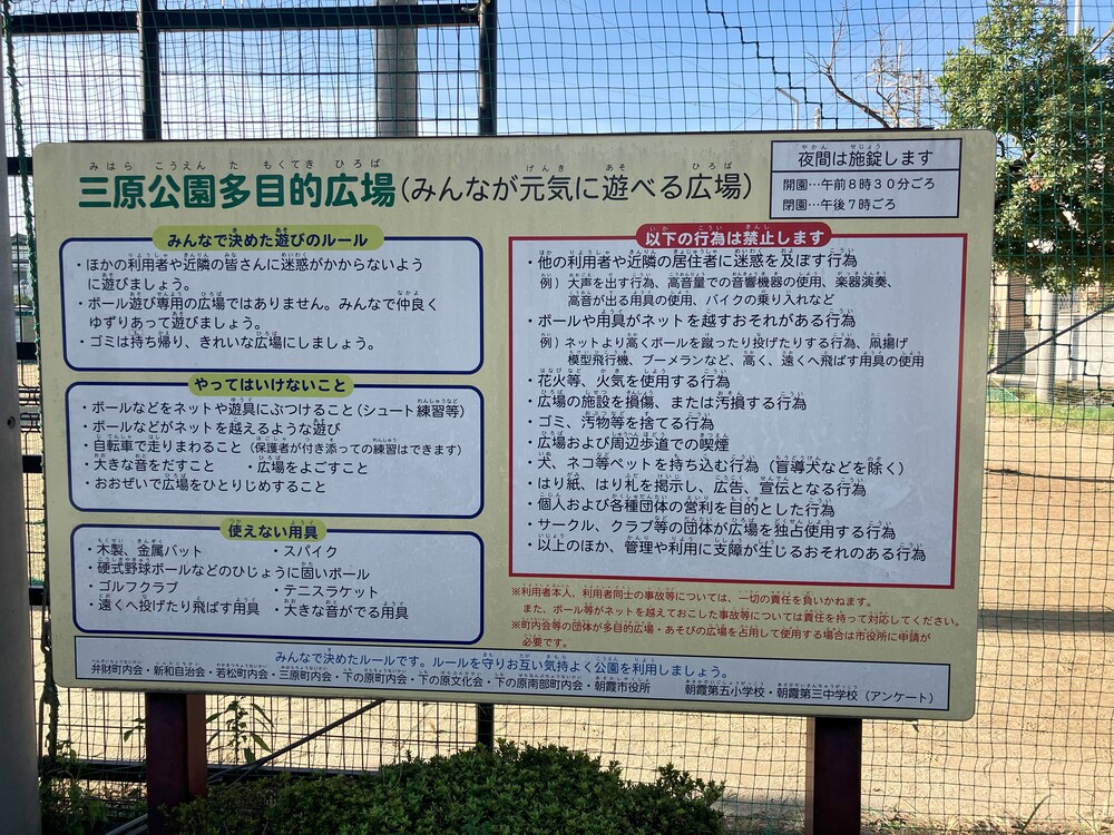 公園の開園時間は午前8時30分頃から午後7時頃までで、夜間は施錠されるなど、安全管理も徹底されています。入口には利用ルールの看板が掲示されており、地域のみなさんがマナーを守って利用している様子が伺えます。