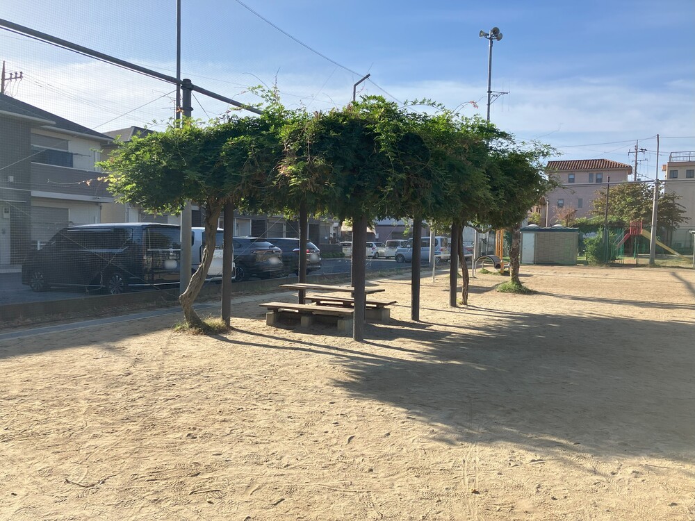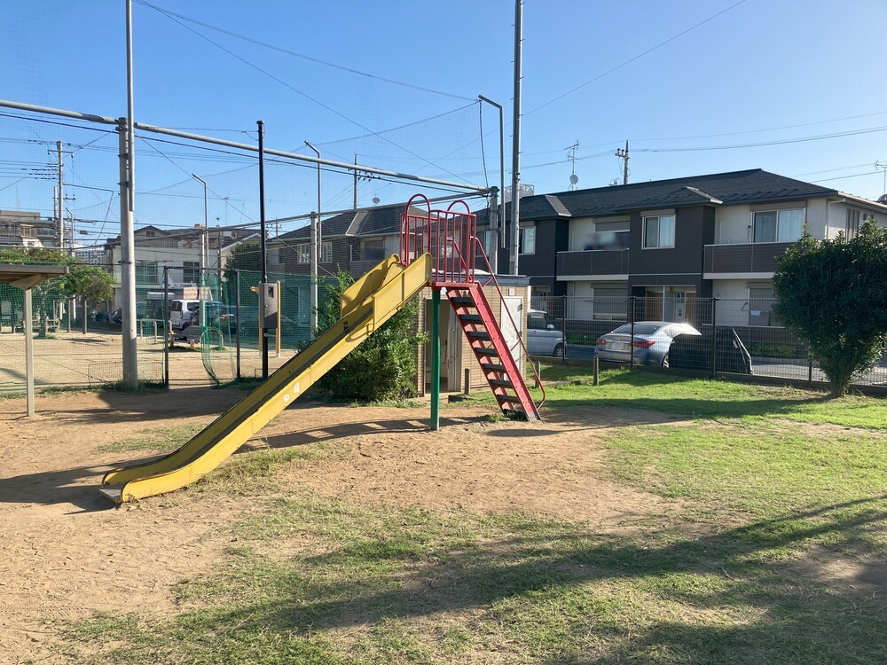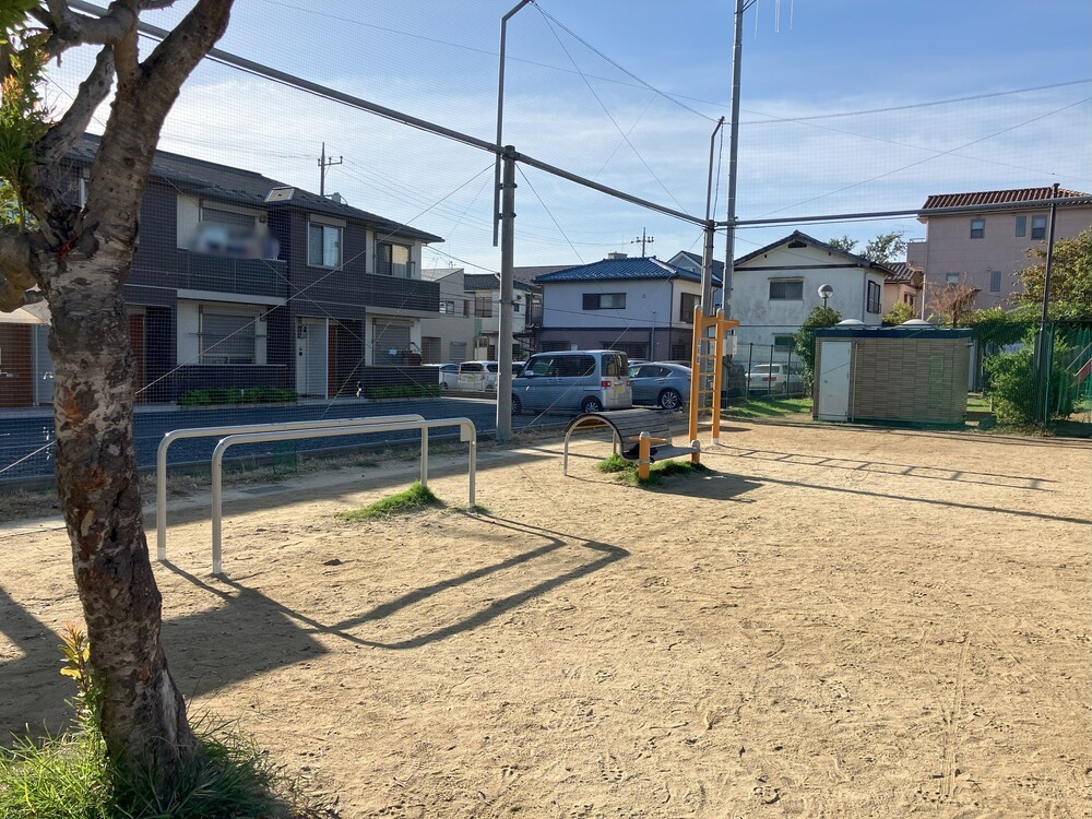 住宅街の公園としては珍しく、ボール遊びができるスペースがしっかり確保されています。四方がネットで囲まれており、地面に高低差もないため、小さなお子様でも安心して遊ぶことができます。