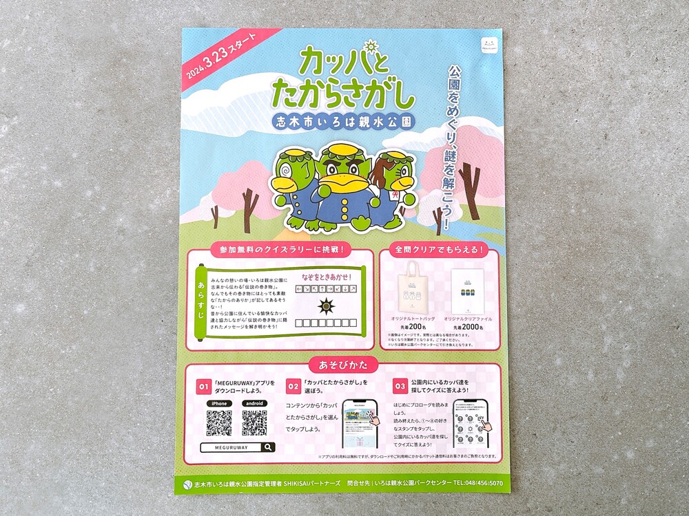 2024年3月23日から開催されているこちらのイベントは、公園のどこかにある8つのクイズに正解して、伝説の巻物に記された「たからのありか」を見つけるというもの。