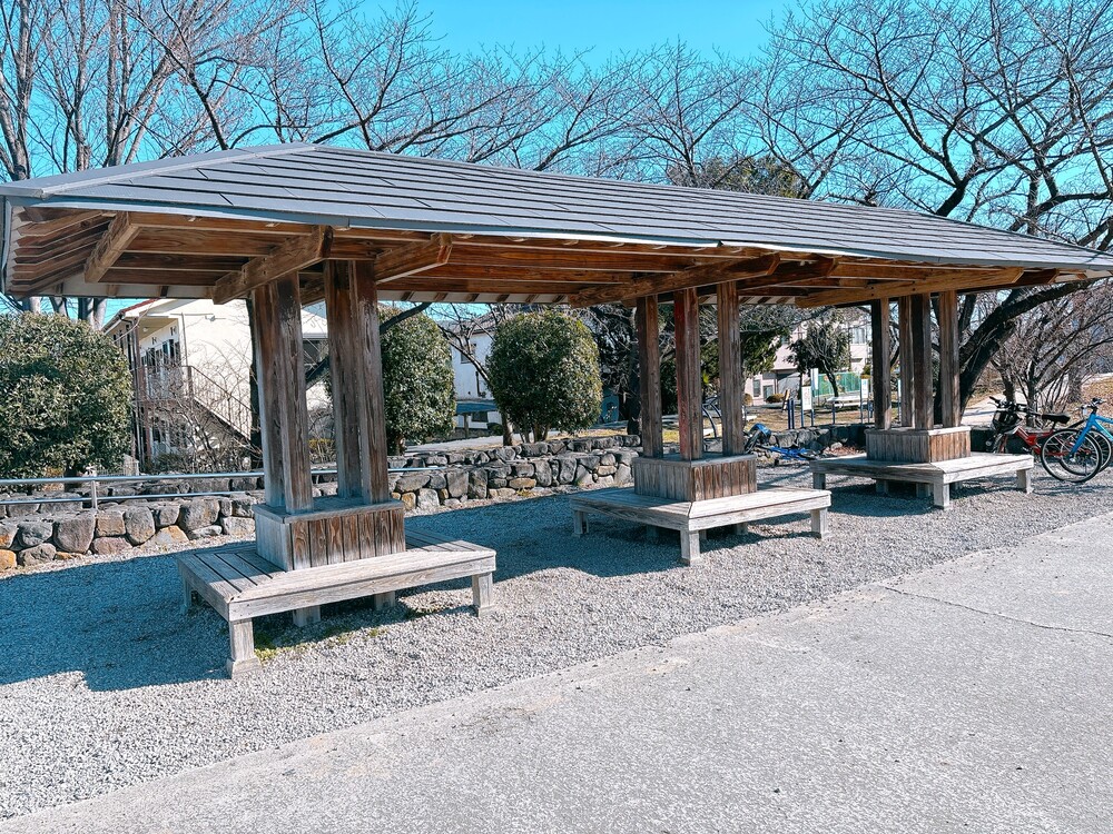 疲れたら、健康遊具エリアの近くにある四阿(あずまや)で休憩もアリ。