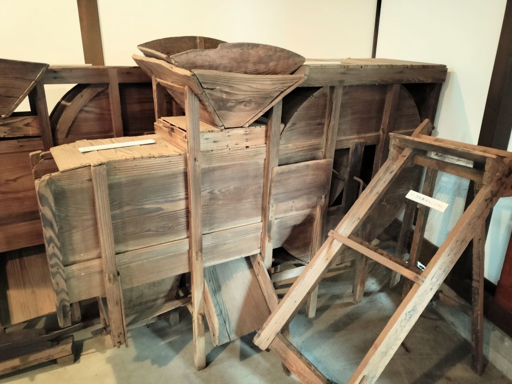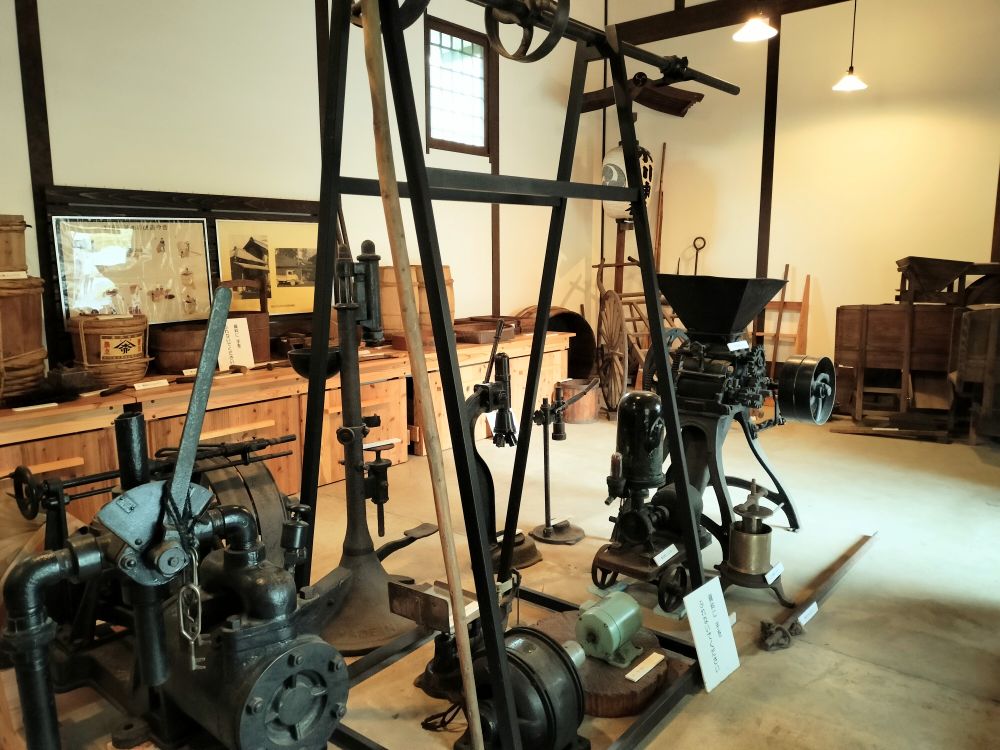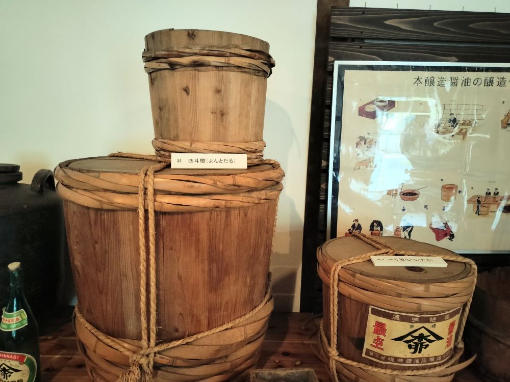 門をくぐって右側にある醤油資料館では、過去に醤油醸造に使われていたさまざまな道具が展示されています。