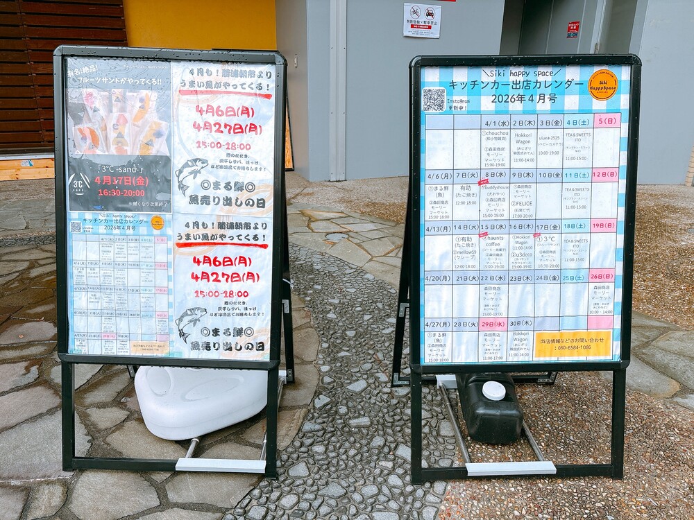 こちらの看板は出店のない日でも置いてあるので、いつでもスケジュールを確認することができますよ。