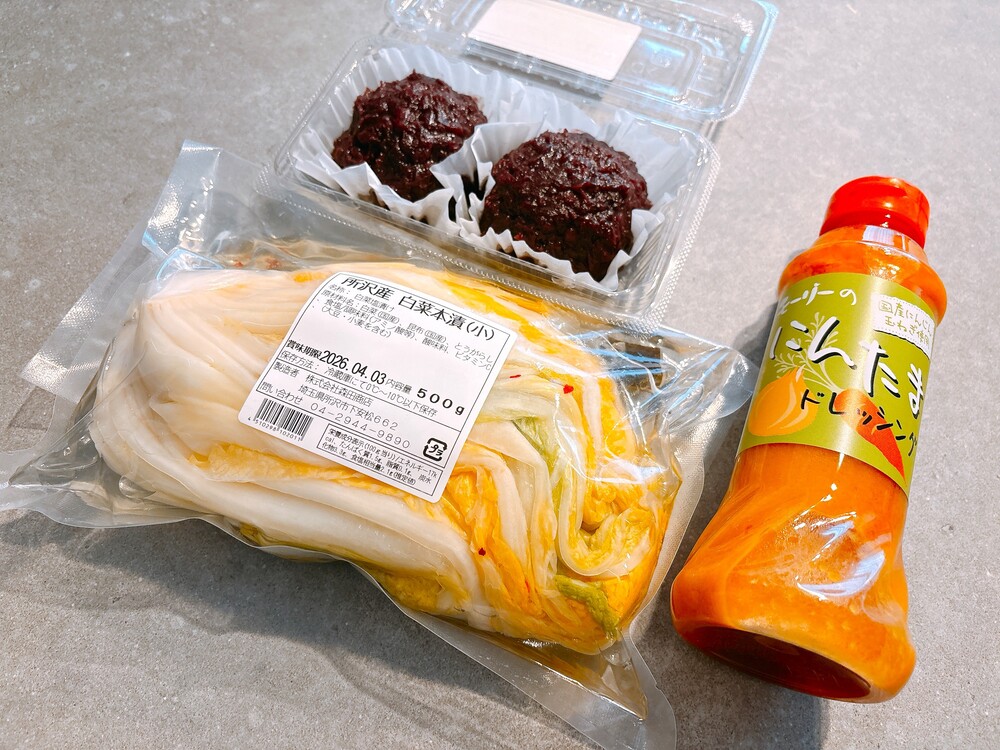 一番人気の白菜本漬、にんたまドレッシング、おはぎです。