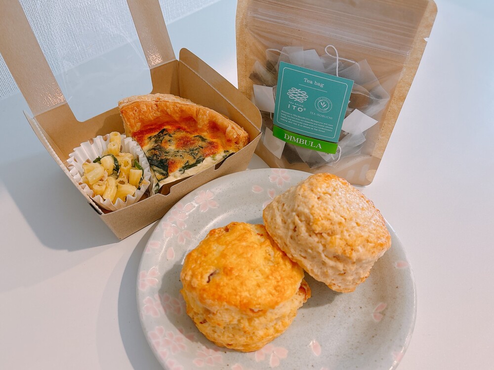 里いもと人参のキッシュ、いちごヨーグルトとナッツクリームのスコーン、ディンブラのティーバッグです。