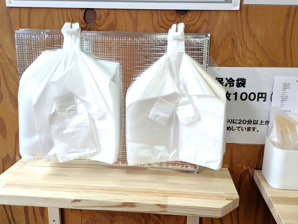 袋や有料の保冷バッグもお店に置いてくれています。餃子の焼き方レシピも置いてあるので、料理初心者の方も安心ですね♪