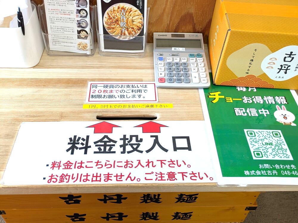「古丹製麺無人餃子販売所 和光白子店(以下、ぎょうざの古丹)」です。