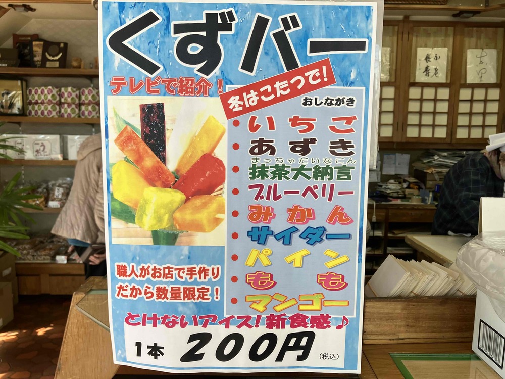 店内で目立つ場所に見えるのが「くずバー」の紹介ポップです。